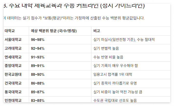3. 주요 대학 체육교육과 수능 커트라인 (정시 가이드라인)