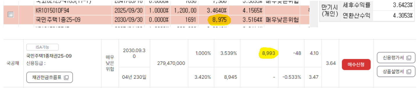 아래는 국민주택1종25-09상품의 증권사별 가격이다.