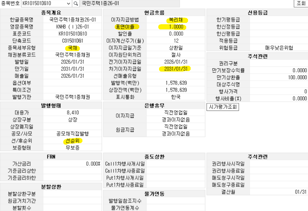 국민주택1종 26-01채권 상품 안내 - 각 증권사에서 제공한다. 모든 국민 주택 채권은 표면 이율이 같고, 5년 만기이다. 만기일과 매수단가만 봐도 된다.