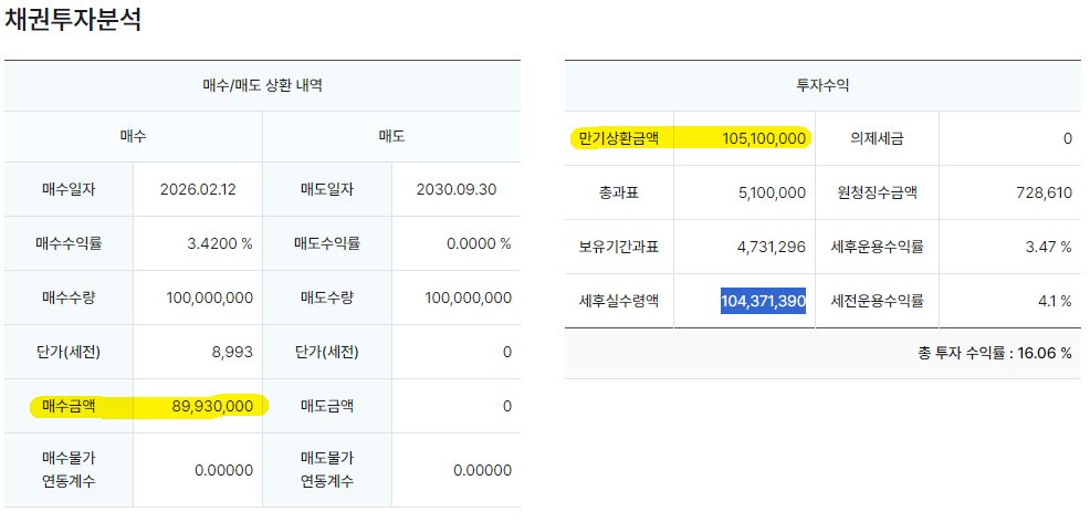 즉, 매수금액 89,930,000원이고, 만기 상환금액은 105,100,000원.